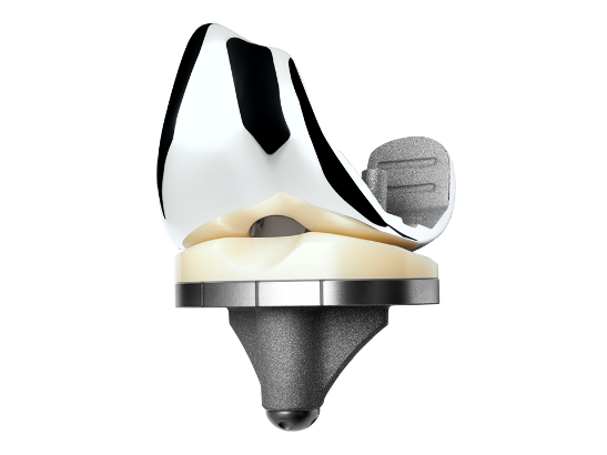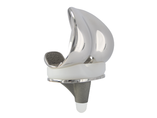 La présence de la cage fémorale et du plot en PE entraîne une stabilisation postérieure de l'articulation du genou entre le composant fémoral et le composant tibial.