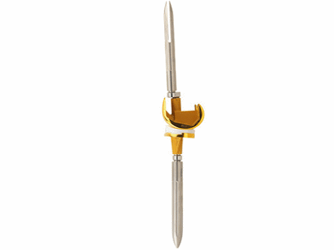 Implant indiqué lors d'arthroplastie du genou avec contrainte et révision, également avec des défects osseux importants.